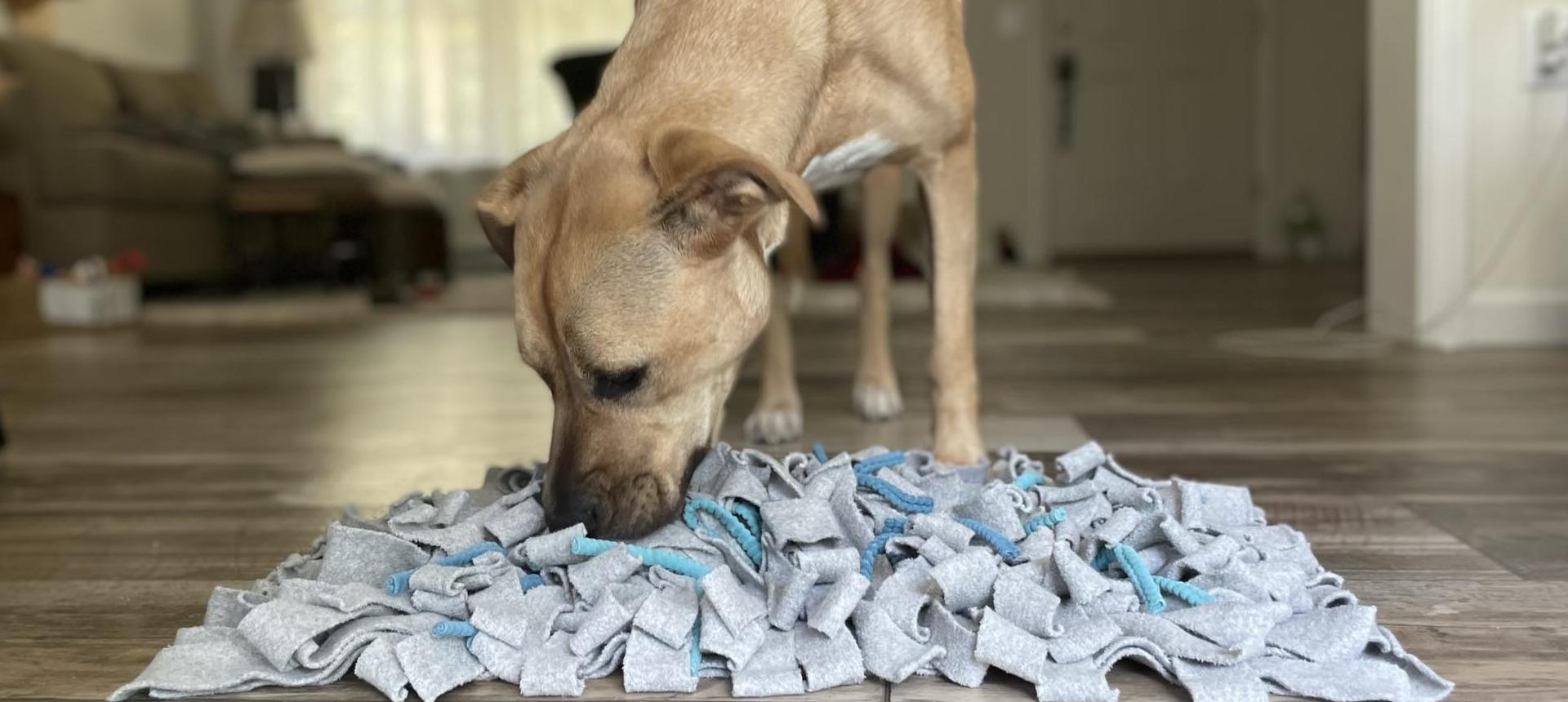 After having ACL surgery on his back knees, it is important to find natural and enriching activities he can do while healing and having to be less mobile than usual. It is easy for me to fit his morning meals in this wonderfully soft and durable mat. He gets so excited when he sees me getting it ready, and as you can see, it gives him something to do in the busy mornings that is very soothing and calming for him.